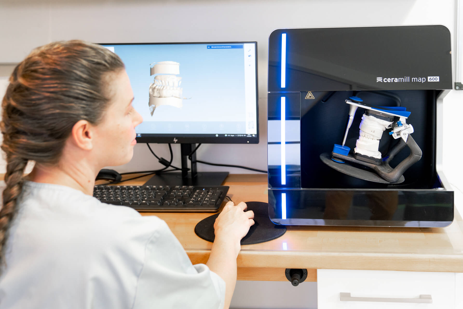 Im Anschluss an die Konstruktion der prothetischen Versorgung werden Ihre Daten an eine Fräsmaschine oder an einen 3D-Drucker weitergeleitet: Zahnersatz oder auch Hilfsmittel wie Bohrschablonen entstehen auf diese Weise.
